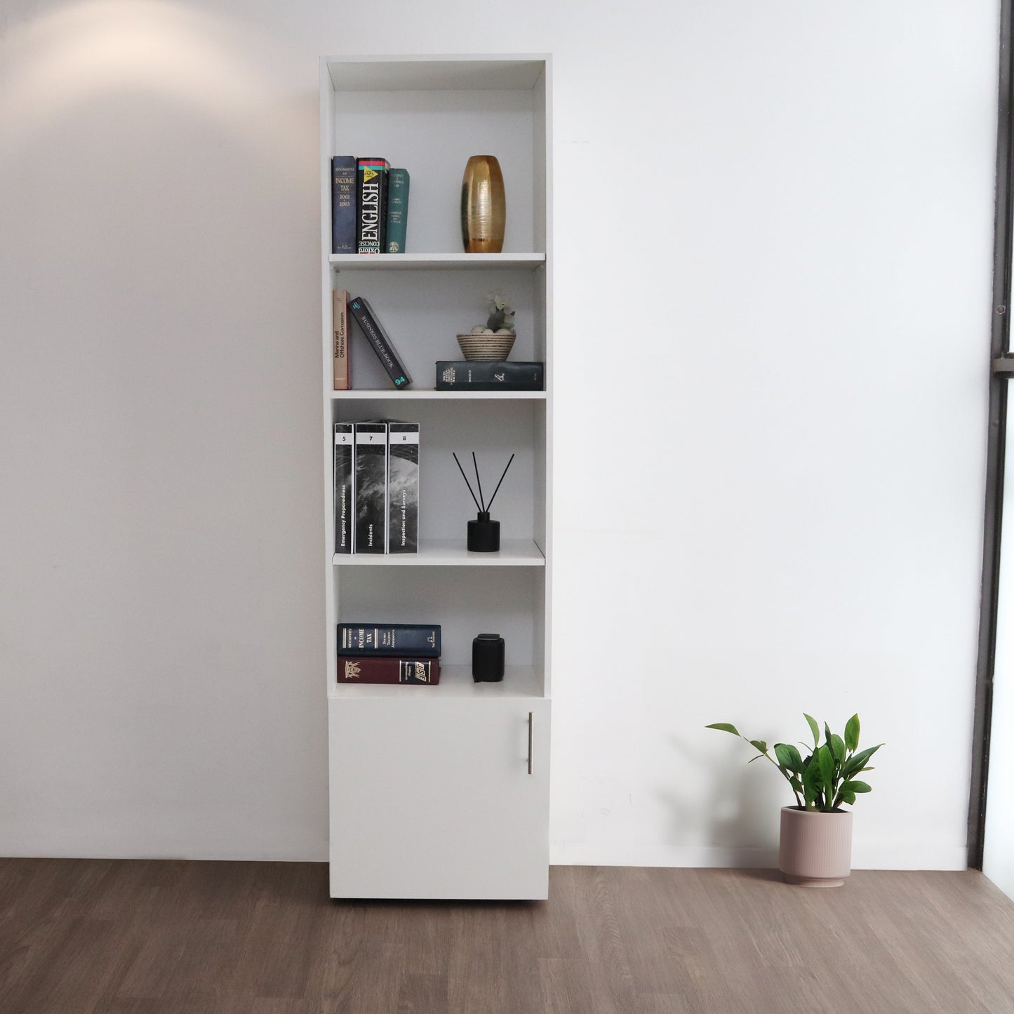 Introducing the Denver Bookcase with 5 shelves and a bottom door for added storage and organization reduce clutter and create a clearer living space.