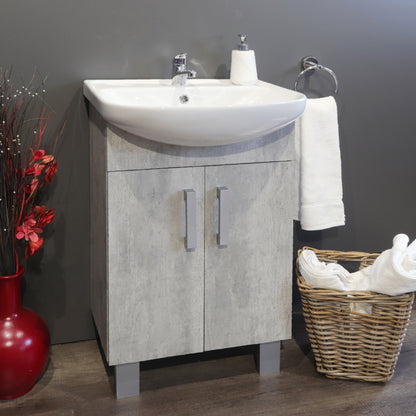 The Estillo floor standing bathroom vanity cabinet and ceramic basin is a modern vanity design finished in the latest cement grey style | 550mm width |Â Bathroom vanity style and design from Valenti | Excludes Tap & Waste Fittings