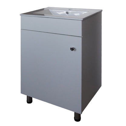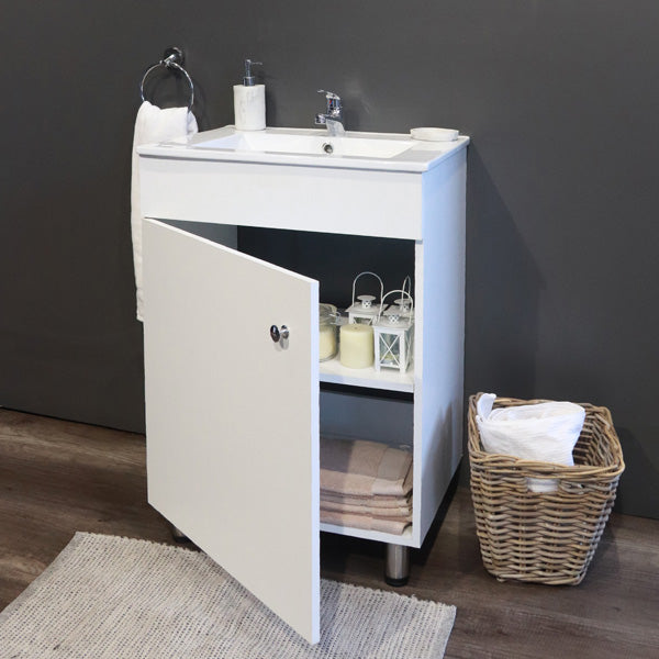 The Stylo bathroom vanity cabinet is a contractors floor mounted bathroom vanity. Available in white with a premium porcelain ceramic basin and cupboard for storage.
